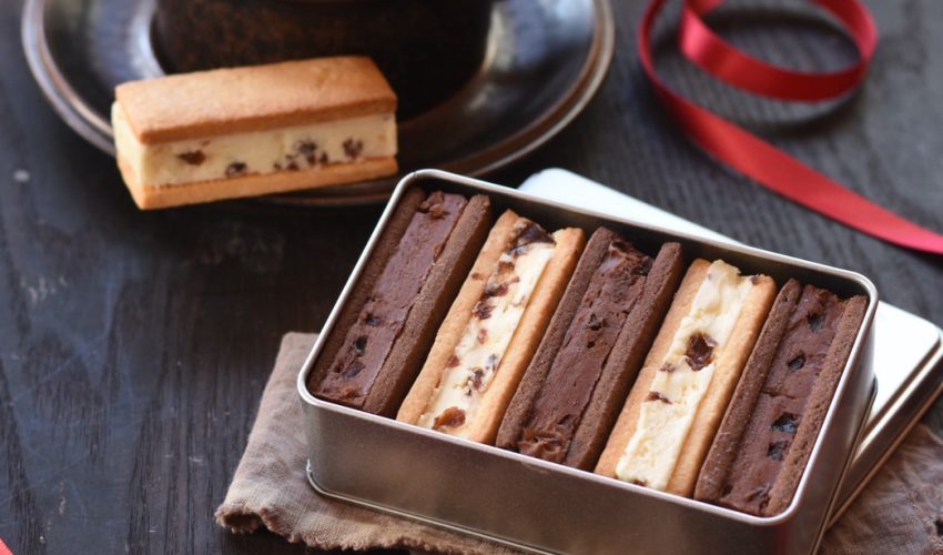 バレンタインらしく、チョコレート味とホワイトチョコレート味の2つの味が楽しめるバターサンドをご用意しました。